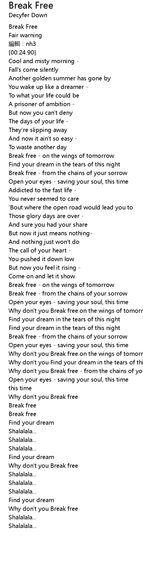 | [01:18.43] | Break free - from the chains of your sorrow |