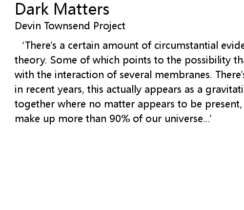 | ' There' s a certain amount of circumstantial evidence in support of a brane theory. Some of which points to the possibility that the universe may have begun with the interaction of several membranes. There' s a lot of talk of Dark Matter in recent years, this actually appears as a gravitational force pulling matter together where no matter appears to be present, yet this mysterious material may make up more than 90 of our universe...' |
