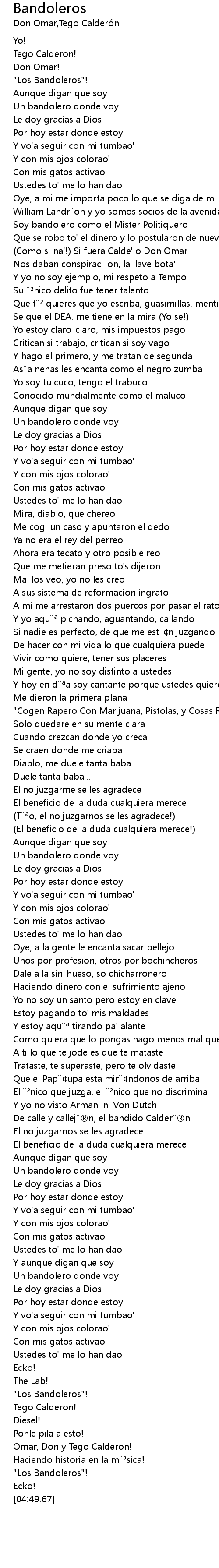 | [00:48.34] | Soy bandolero como el Mister Politiquero |