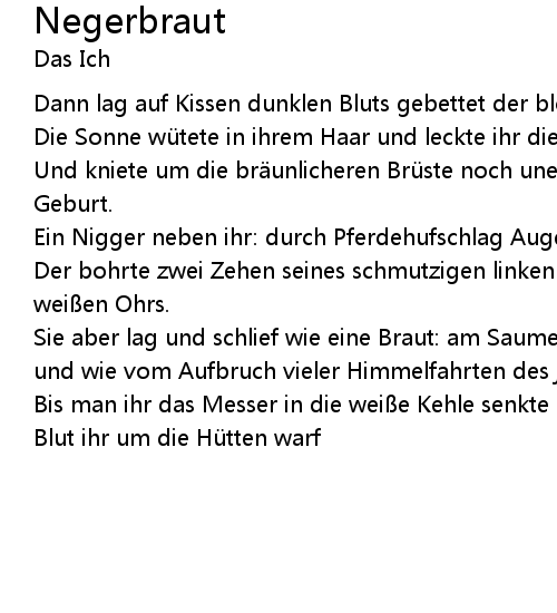 | Dann lag auf Kissen dunklen Bluts gebettet der blonde Nacken einer weißen Frau. | |