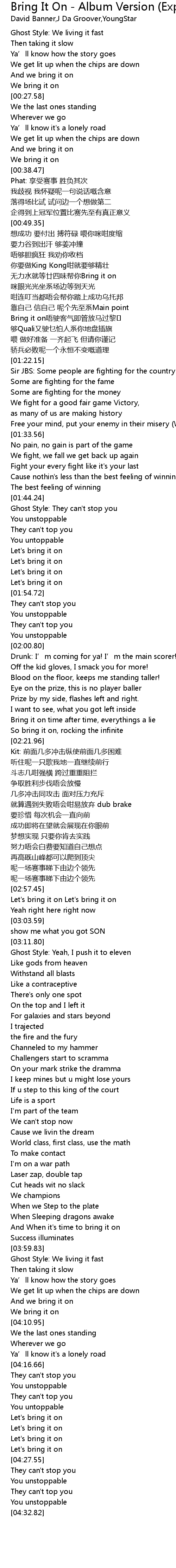 | [01:11.63] | Bring it on唔驶客气即管放马过黎 |