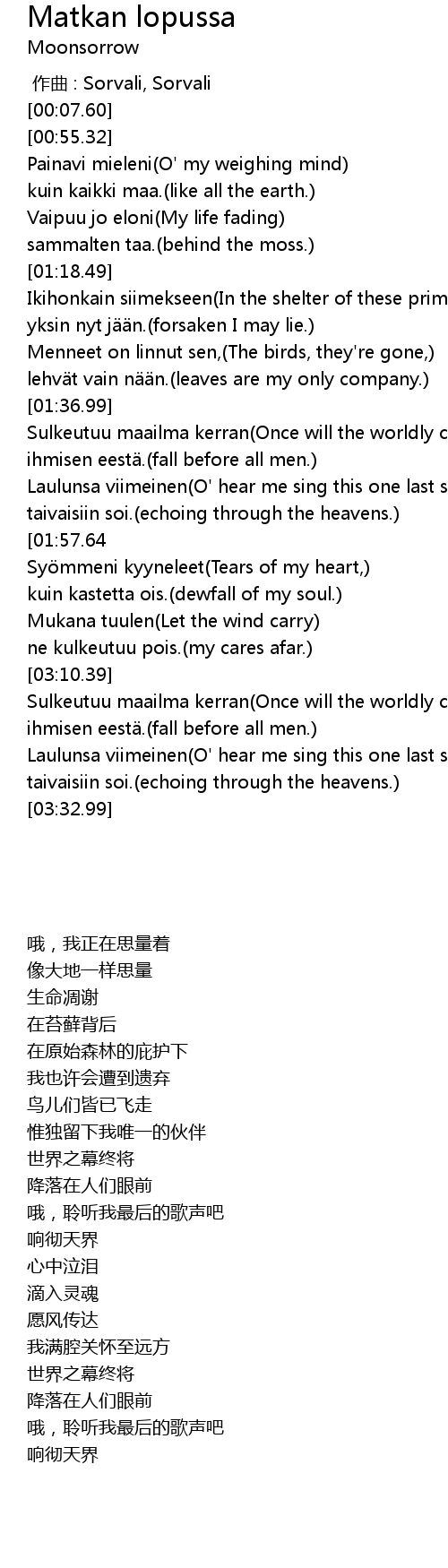| [03:21.87] | Laulunsa viimeinen(O' hear me sing this one last song) |