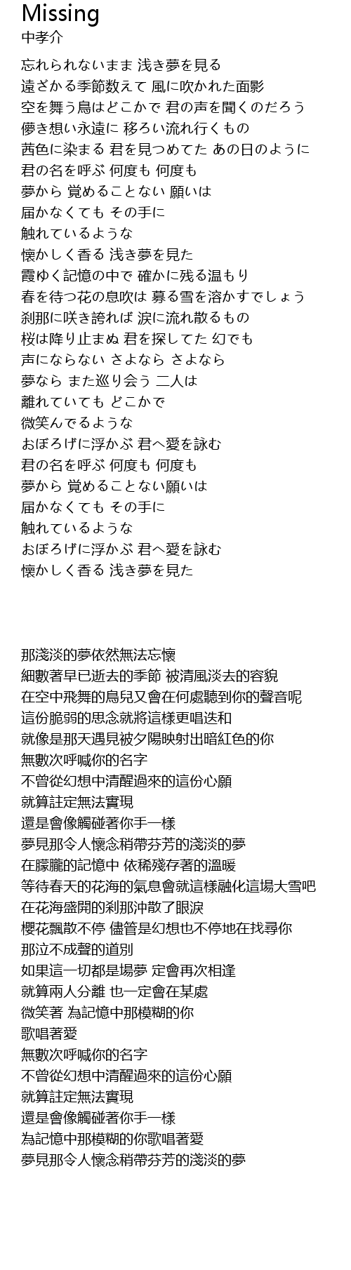 | [02:34.41] | 櫻花飄散不停 儘管是幻想也不停地在找尋你 |