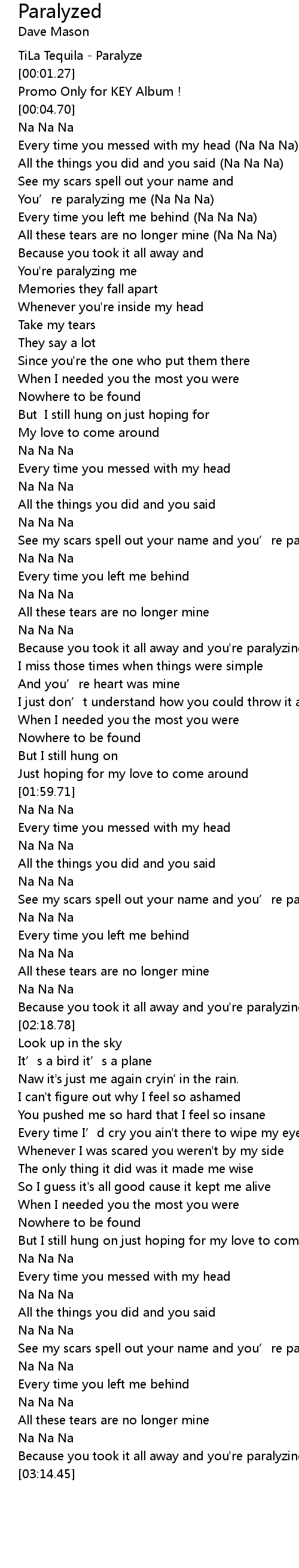 | [03:09.59] | Because you took it all away and you're paralyzing me |