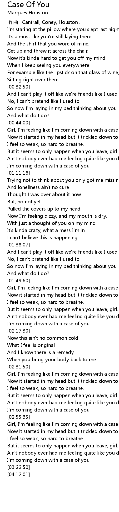 | [00:44.96] | Girl, I' m feeling like I' m coming down with a case of you. |