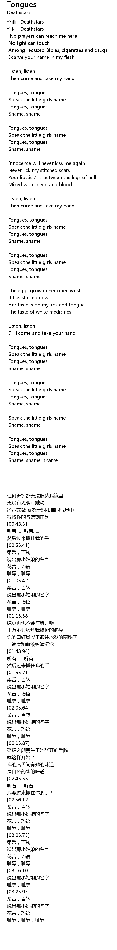| [01:35.64] | 你的口红斑驳于通往地狱的两腿间 |