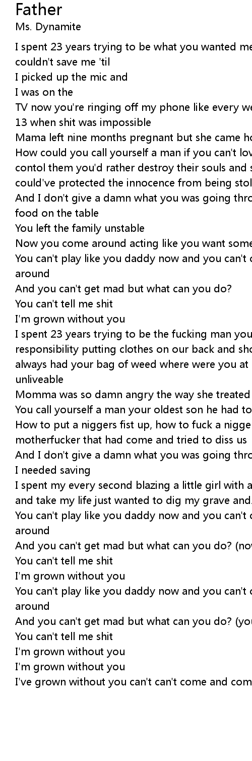I spent 23 years trying to be the fucking man you should be taking care of your responsibility putting clothes on our back and shoes on our feet no help but you always had your bag of weed where were you at 12,13, 14 and 15 when life was unliveable |