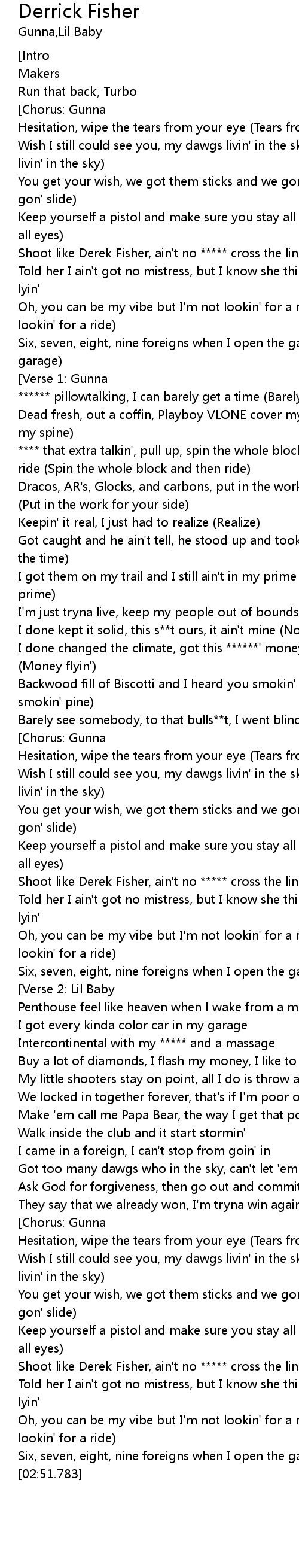 | [02:38.727] | Shoot like Derek Fisher, ain't no ***** cross the line (No) |