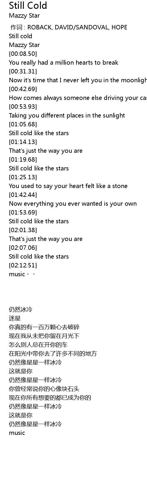 | [01:57.00] | Still cold like the stars |