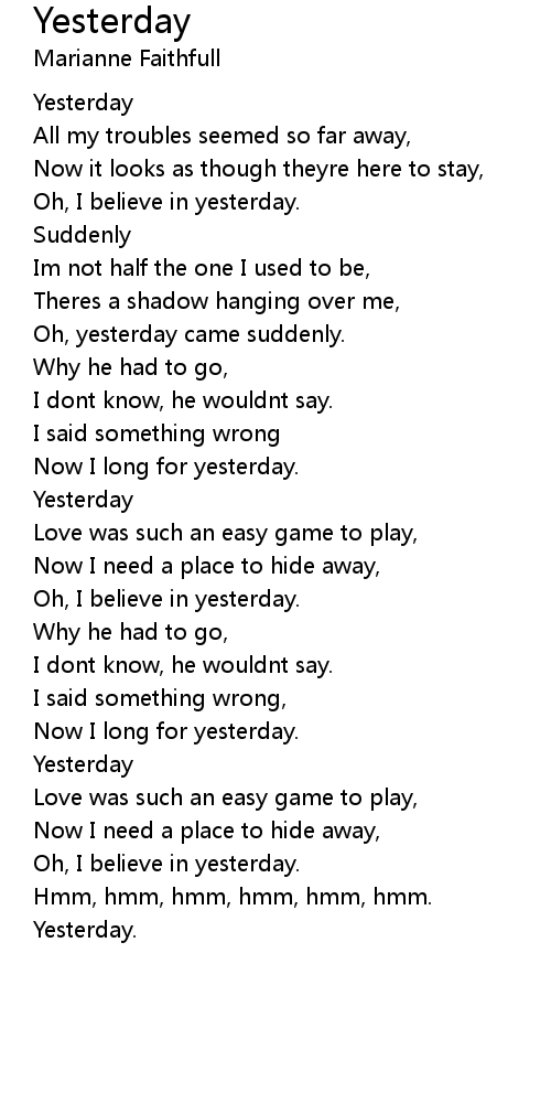 | [00:41.279] | Oh, yesterday came suddenly. |