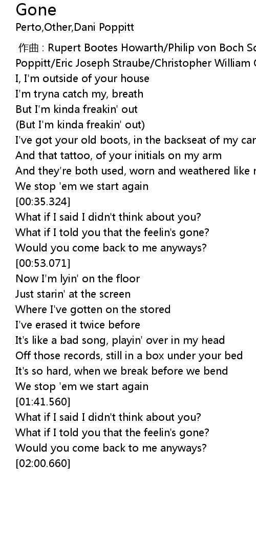 | [00:42.571] | What if I told you that the feelin' s gone? |