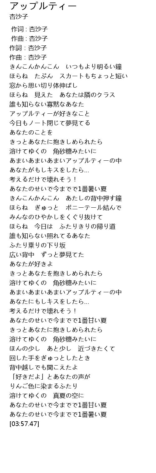 | [02:33.08] | あまいあまいあまいアップルティーの中 |