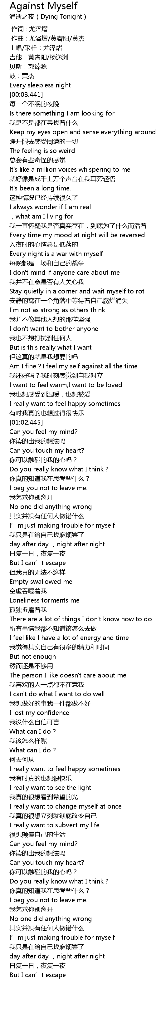 | [00:54.445] | 我还好吗?我时刻感觉到自我对立 |