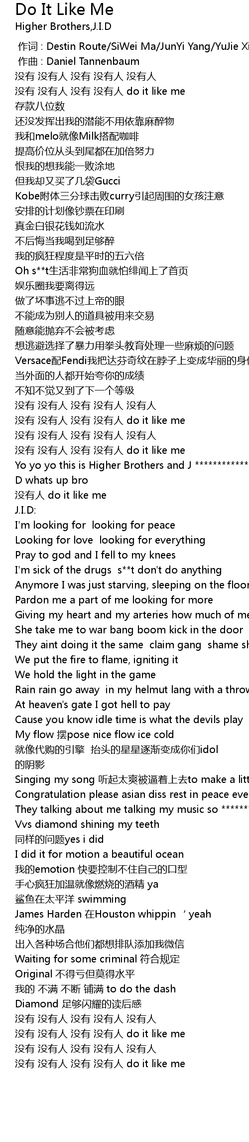 | [01:04.617] | Yo yo yo this is Higher Brothers and J ************* I ************* D whats up bro |