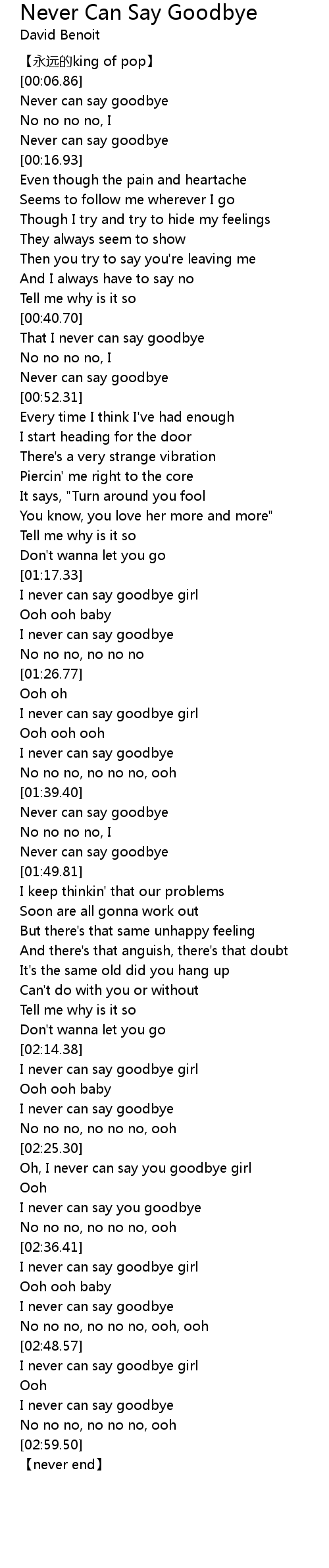 | [02:25.91] | Oh, I never can say you goodbye girl |