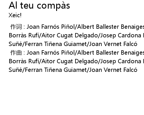 | [00:00.000] | zuò qǔ : Joan Farnó s Pi ol Albert Ballester Benaiges Romá n Borrà s Rufí Aitor Cugat Delgado Josep Cardona Pallares Jordà n Rius Sué Ferran Ti ena Guiamet Joan Vernet Falcó |
