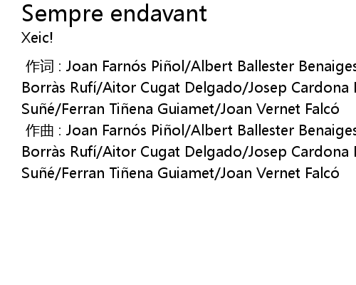 [00:00.000] 作词 : Joan Farnós Piñol/Albert Ballester Benaiges/Román Borràs Rufí/Aitor Cugat Delgado/Josep Cardona Pallares/Jordàn Rius Suñé/Ferran Tiñena Guiamet/Joan Vernet Falcó