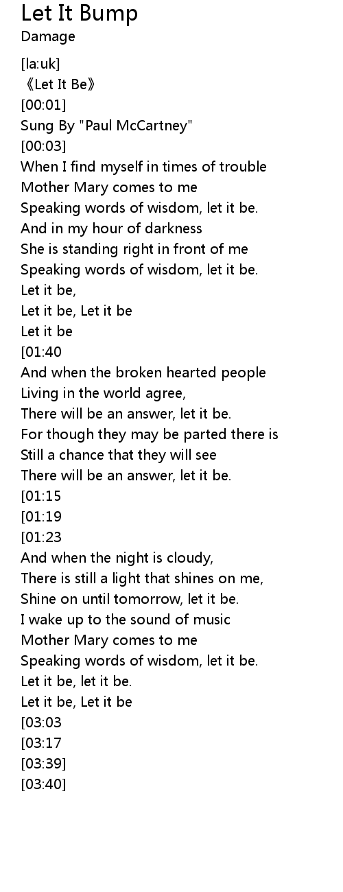 | [02:26][01:40][00:40] | Whisper words of wisdom, let it be. |