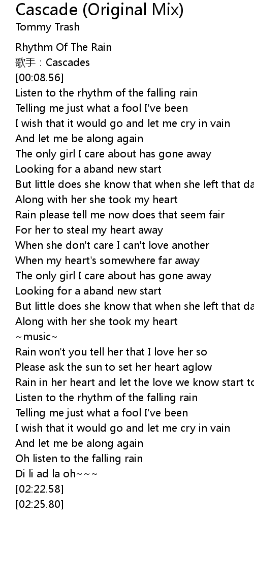 | [00:13.39] | Listen to the rhythm of the falling rain |