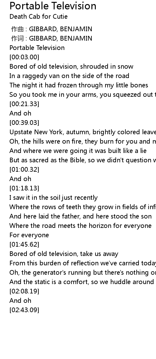 | [02:03.63] | And the static is a comfort, so we huddle around and stare |