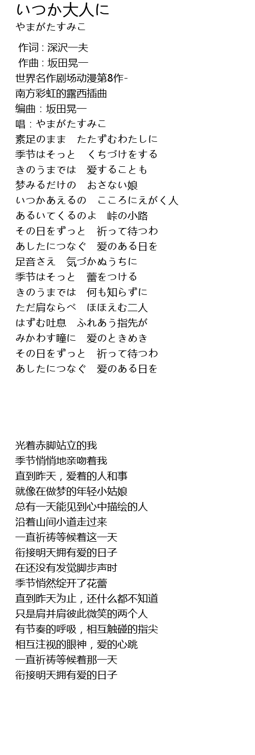 | [00:49.710] | いつかあえるの こころにえがく人 |