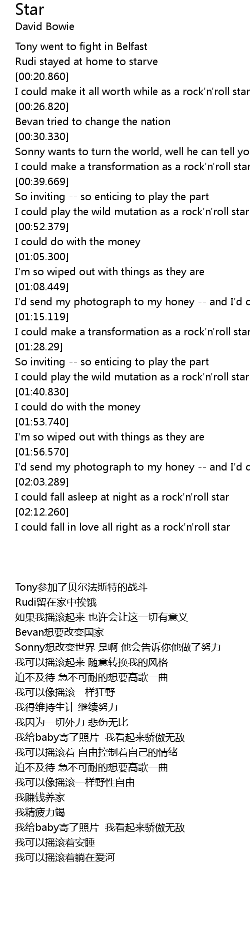 | [00:36.89] | I could make a transformation as a rock'n'roll star |