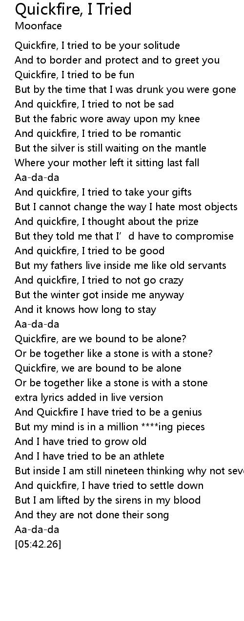 | [00:57.11] | Quickfire, I tried to be your solitude |