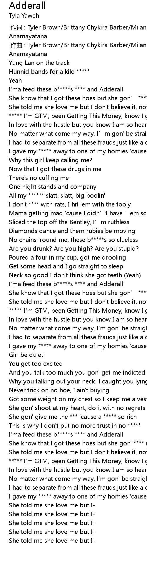 | [00:12.448] | I'ma feed these b*****s **** and Adderall |
