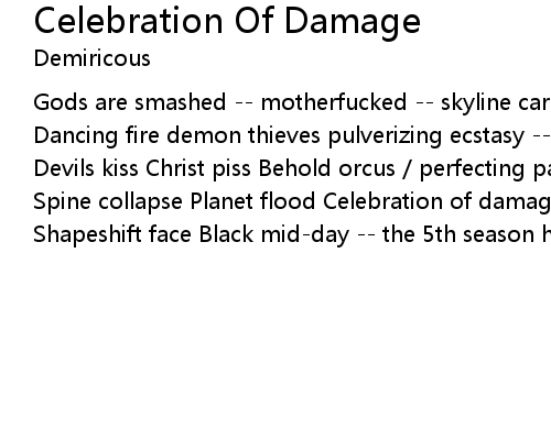 | Dancing fire demon thieves pulverizing ecstasy -- hail and kill | |
