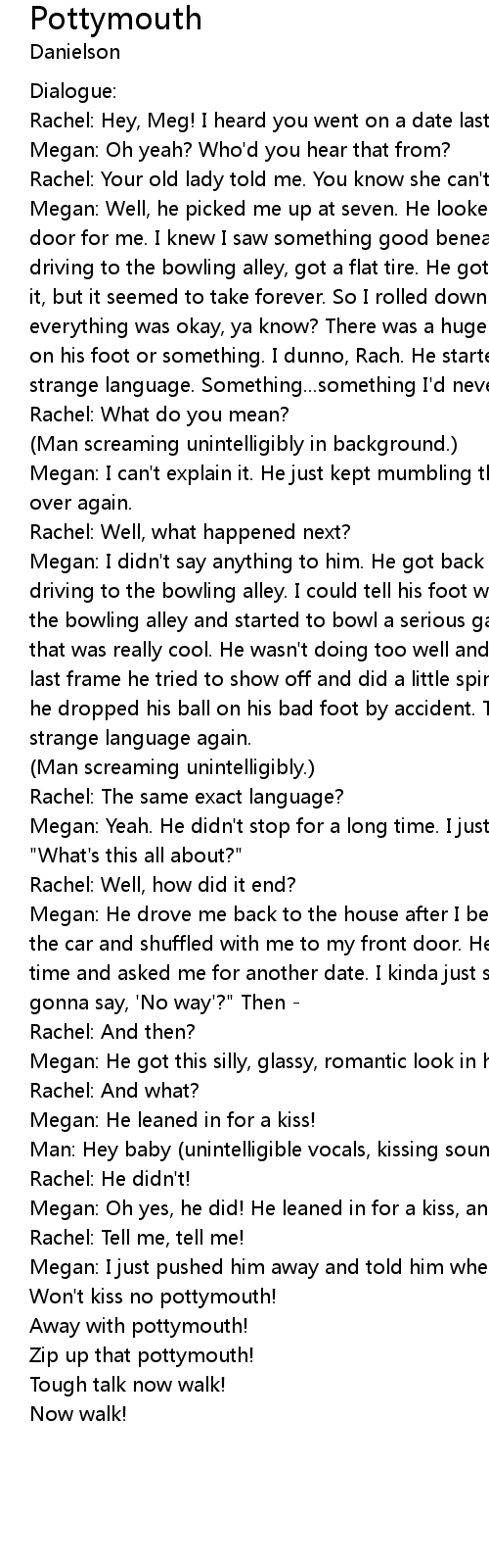 Megan: Well, he picked me up at seven. He looked pretty good. He even opened the door for me. I knew I saw something good beneath that bad boy facade. We were driving to the bowling alley, got a flat tire. He got out and started changing it, but it seemed to take forever. So I rolled down the window to ask him if everything was okay, ya know? There was a huge crash, and I think the car fell on his foot or something. I dunno, Rach. He started...started mumbling this strange language. Something...something I'd never heard before. |