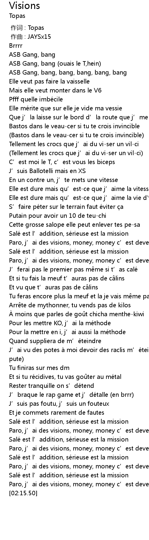 | [02:11.36] | Paro, j’ai des visions, money, money c’est devenu une addiction |