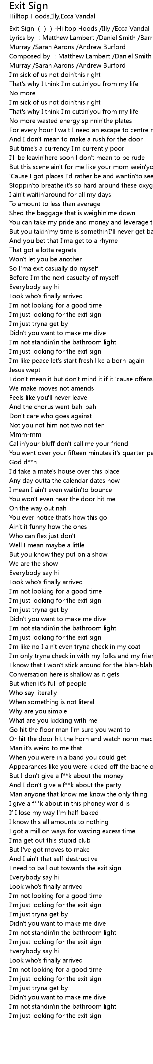 | [00:00.00] | Exit Sign ())-Hilltop Hoods /Illy /Ecca Vandal |