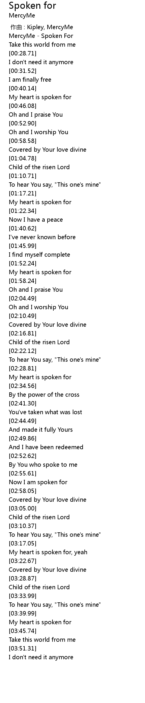 | [00:07.55] | MercyMe Spoken For |