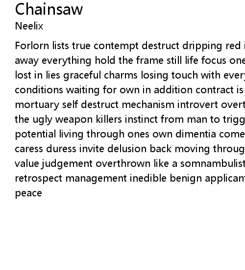 Forlorn lists true contempt destruct dripping red is it time to come clean wash away everything hold the frame still life focus ones intent to not be noticed lost in lies graceful charms losing touch with everyone management terms and conditions waiting for own in addition contract is raised the worlds greatest mortuary self destruct mechanism introvert overturn assasination make from steel the ugly weapon killers instinct from man to trigger peaceful time direct potential living through ones own dimentia come on hold arms dissect division caress duress invite delusion back moving through the keyhole trust in keeping a value judgement overthrown like a somnambulist twisting and churning in retrospect management inedible benign applicants crime to everlasting eternal peace |