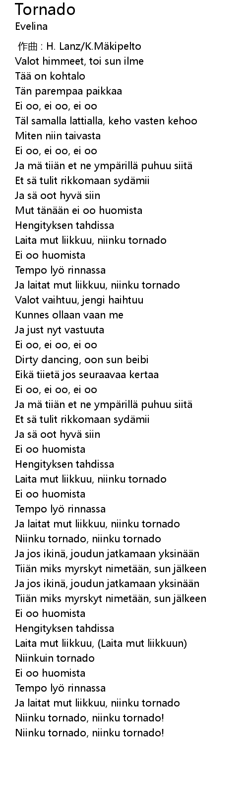 | [03:17.69] | Niinku tornado, niinku tornado! |