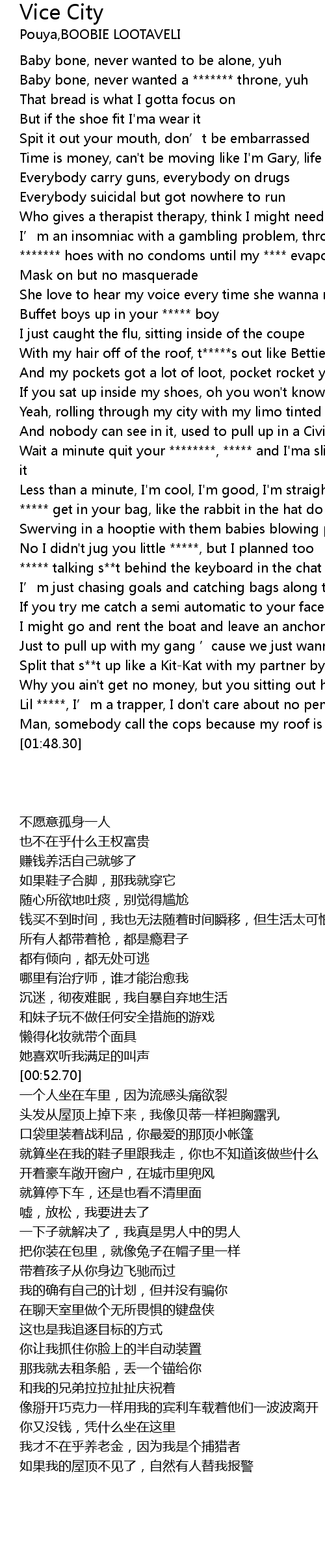 | [00:56.76] | With my hair off of the roof, t*****s out like Bettie Boop |