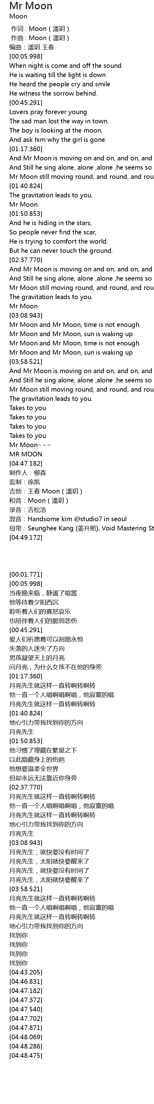 | [03:43.113] | Mr Moon and Mr Moon, time is not enough. |
