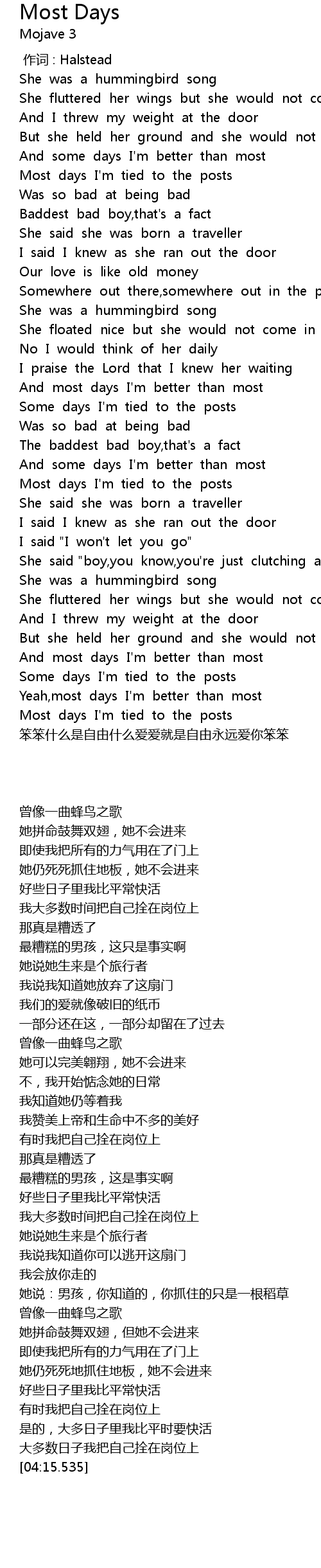 | [02:47.71] | Most days I'm tied to the posts |
