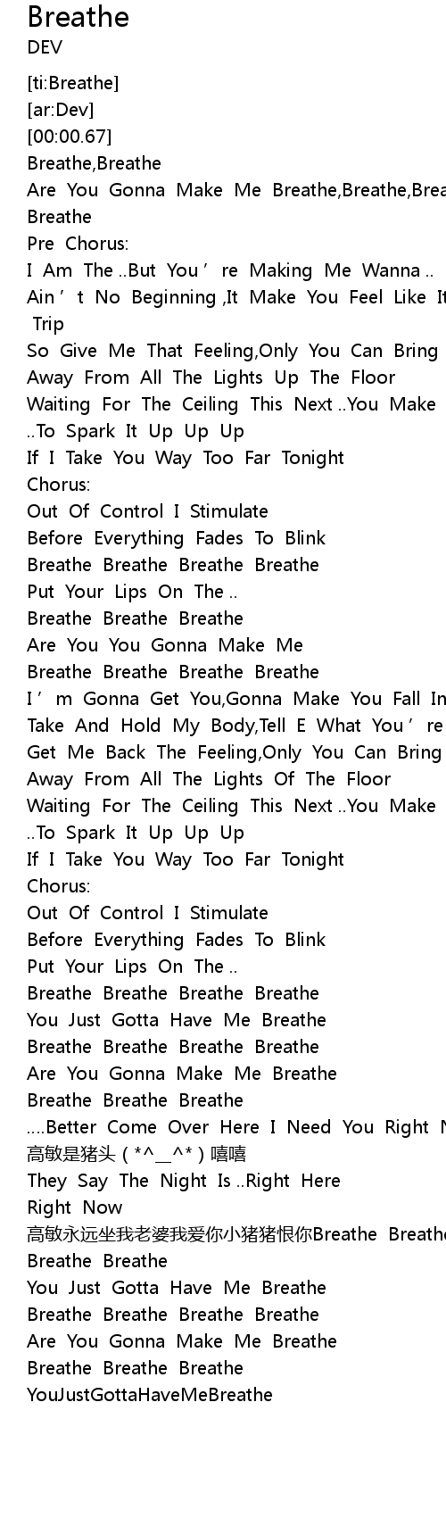 | [02:48.72] | gao min yong yuan zuo wo lao po wo ai ni xiao zhu zhu hen ni Breathe Breathe Breathe Breathe |