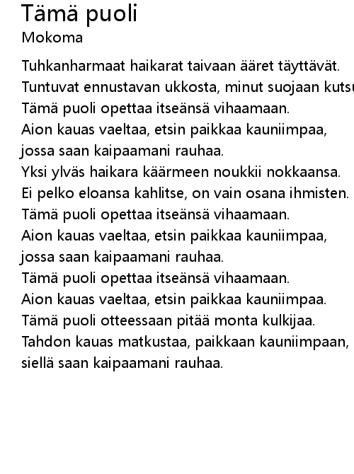 | Aion kauas vaeltaa, etsin paikkaa kauniimpaa. | |