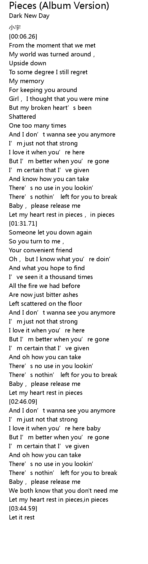 | [03:28.40] | Let my heart rest in pieces, in pieces |