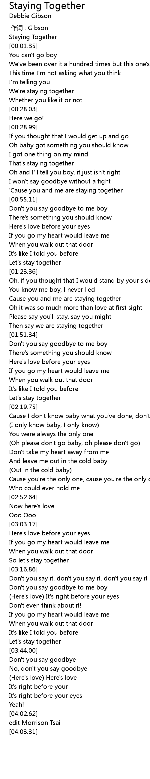 | [00:38.70] | That' s staying together |