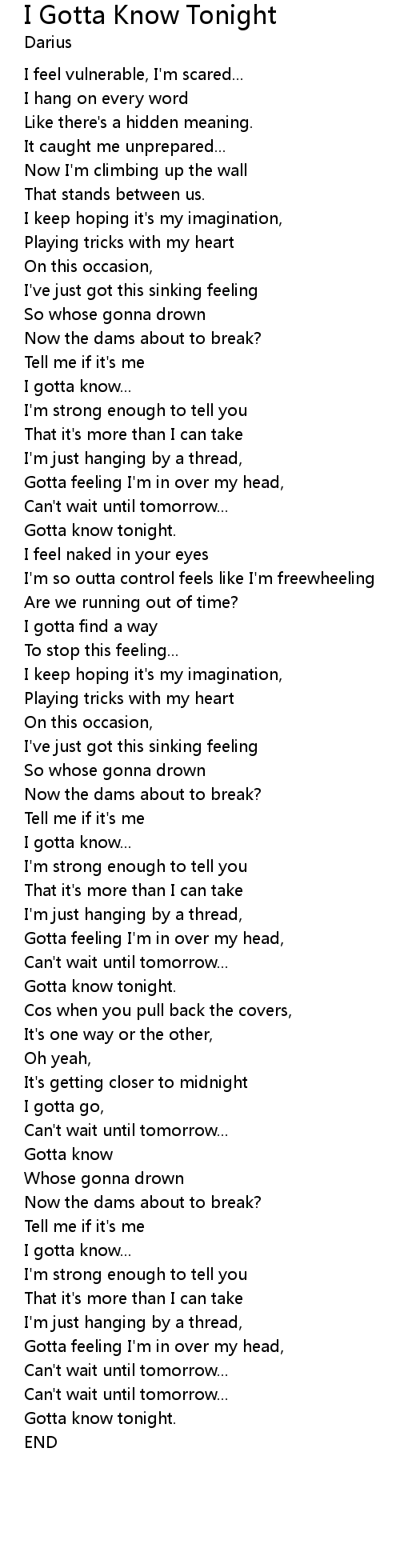 | [02:47.76] | Gotta know tonight. |