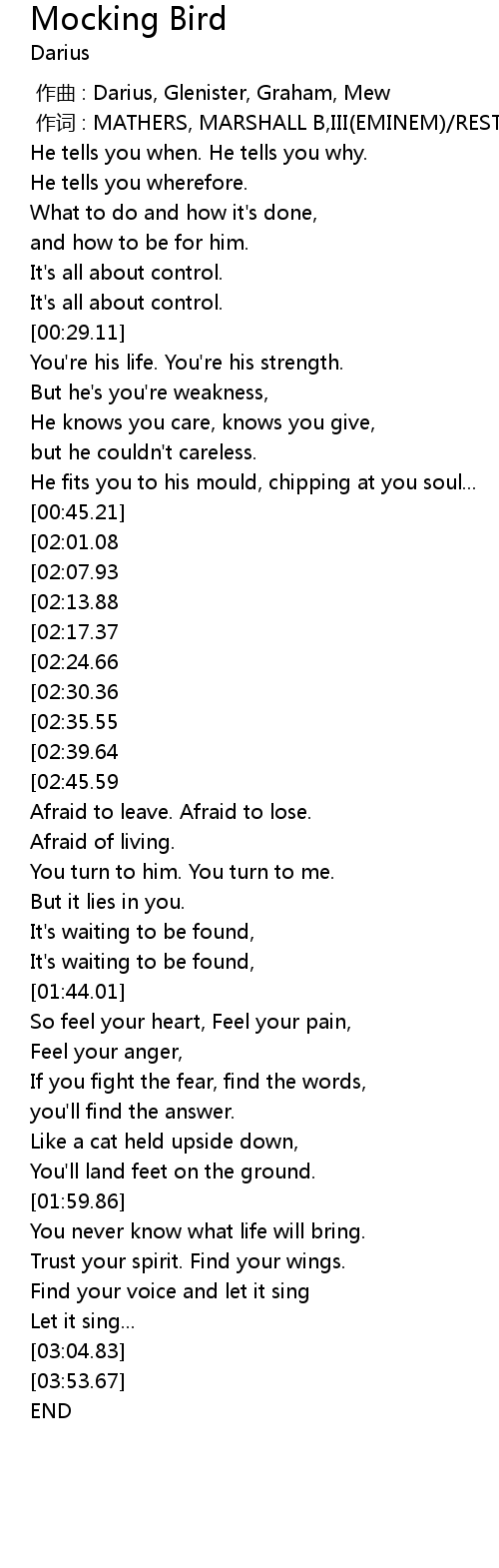 | [03:40.70][02:35.55][01:20.08] | Mockingbird, |
