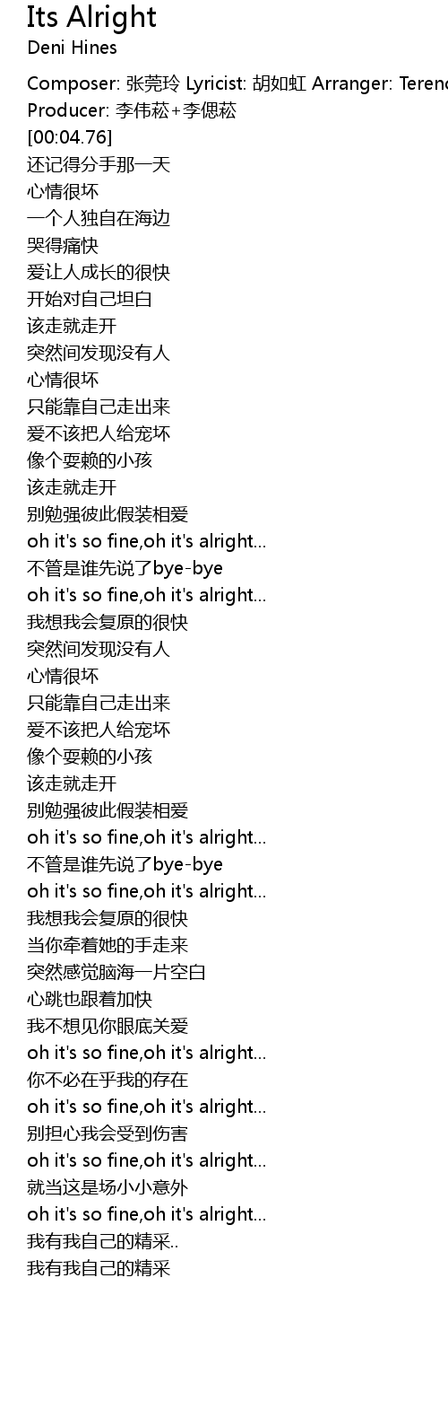 | [00:02.69] | Composer: zhāng guǎn líng Lyricist: hú rú hóng Arranger: Terence Teo Producer: lǐ wěi sōng lǐ cāi sōng |