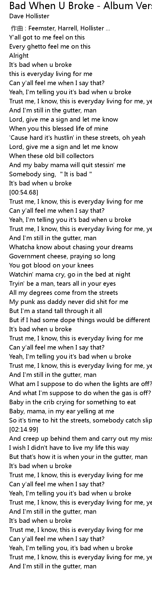 | [00:16.88] | Yeah, I' m telling you it' s bad when u broke |