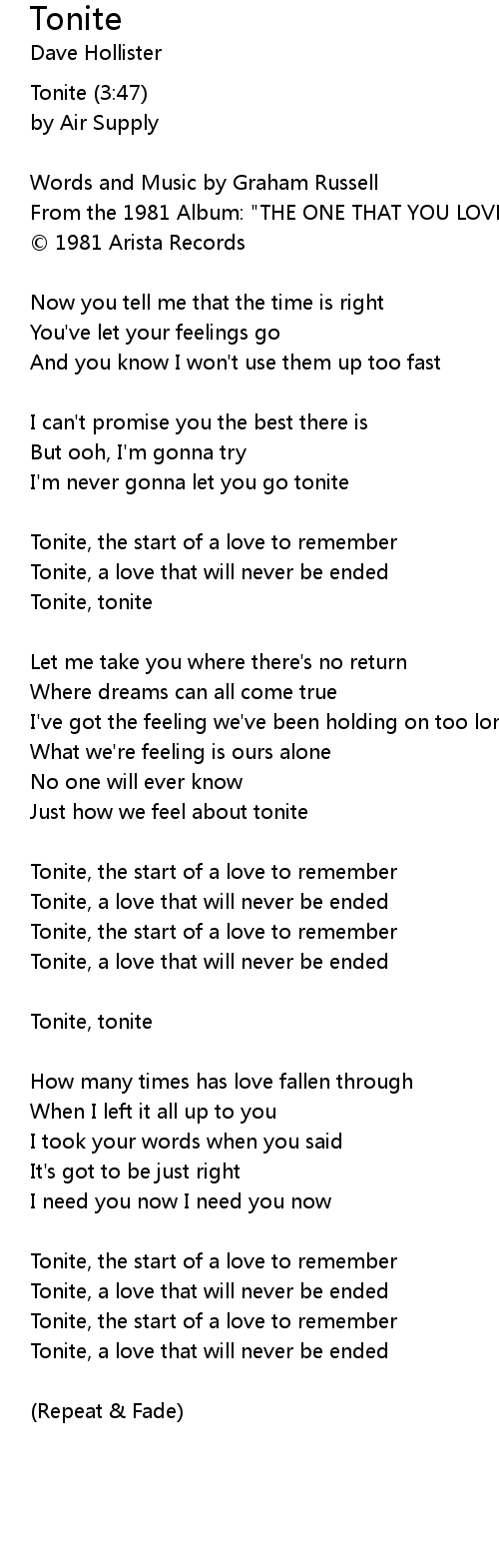 | Tonite, the start of a love to remember | |