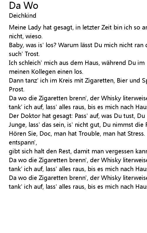 | Dann tanz' ich im Kreis mit Zigaretten, Bier und Sprit, heb' das Glas und sag' Prost. | |