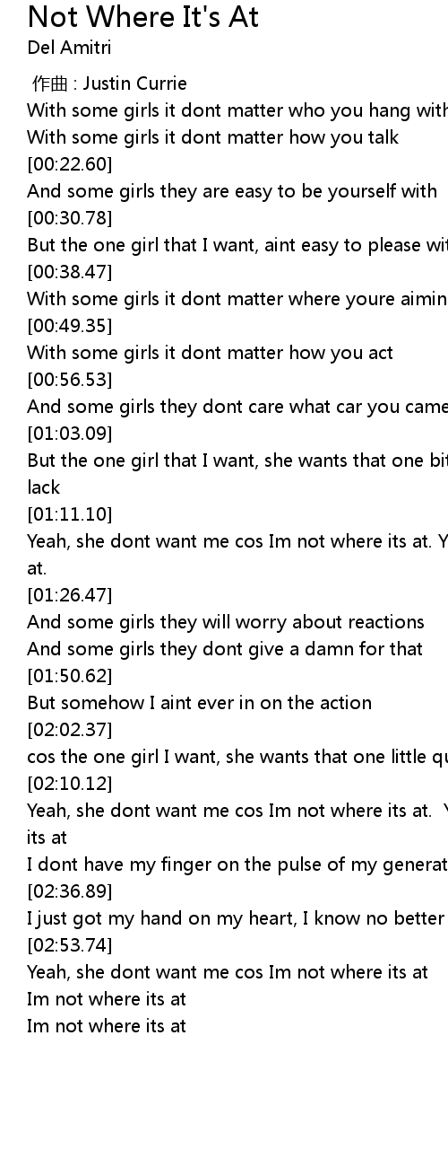 | [01:23.66] | Yeah, she dont want me cos Im not where its at. Yeah Im not where its at. |
