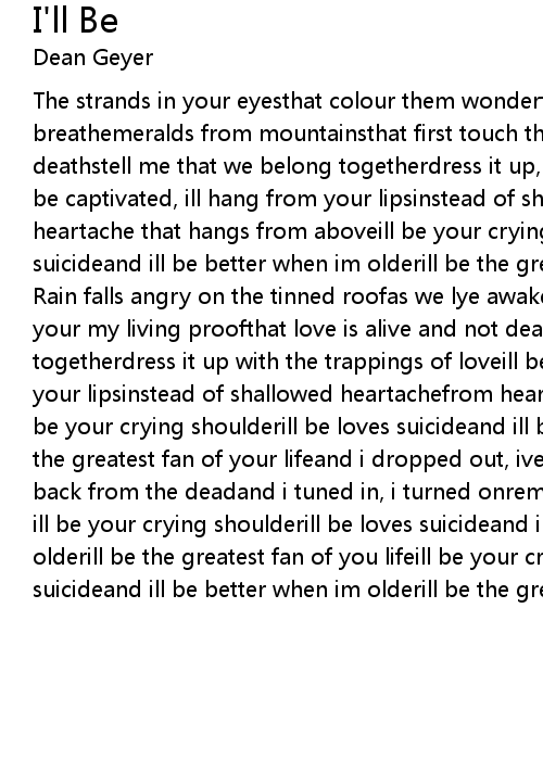 Rain falls angry on the tinned roofas we lye awake in my bedyour my survival, your my living proofthat love is alive and not deadso tell me that we belong togetherdress it up with the trappings of loveill be captivated, ill hang from your lipsinstead of shallowed heartachefrom heartache that hangs from aboveill be your crying shoulderill be loves suicideand ill be better when im olderill be the greatest fan of your lifeand i dropped out, ive burned upive fought my way back from the deadand i tuned in, i turned onremember the things that you saycuz ill be your crying shoulderill be loves suicideand ill be better when im olderill be the greatest fan of you lifeill be your crying shoulderill be loves suicideand ill be better when im olderill be the greatest fan of you life |